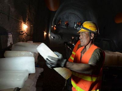การใช้งาน: อากาศในอุโมงค์มีความเบาบางและมีความเข้มข้นออกซิเจนต่ำ อุณหภูมิผนังสูงถึง 60℃ และน้ำแข็งบล็อกถูกนำมาใช้สำหรับทำความเย็นอุโมงค์ ในภาพคนงานกำลังแบกบล็อกน้ำแข็ง